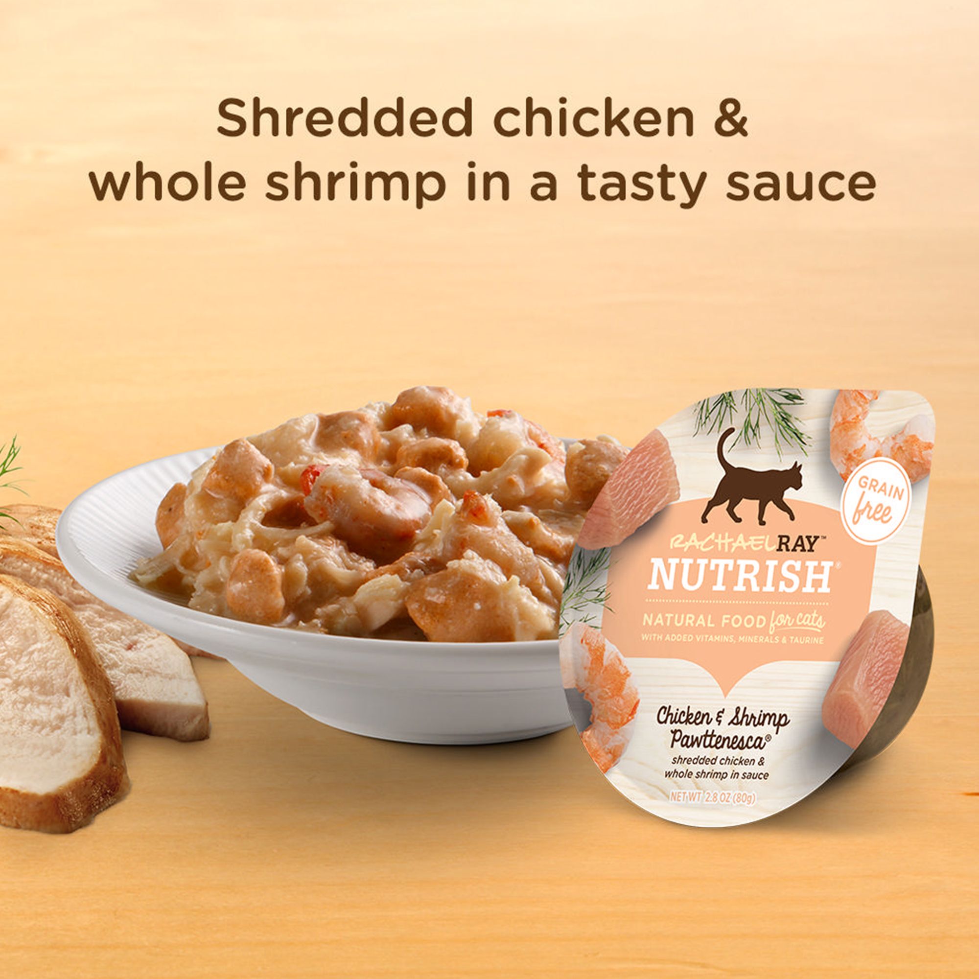 Wet Cat Food Rachael Ray Nutrish Chicken Shrimp Pawttenesca Wet cat food made with real shredded chicken and whole shrimp served in a scrumptious sauce. Rachael Ray Nutrish Purrfect Entrées Sea. Rachael Ray Nutrish Chicken Lovers Variety Pack Natural Grain-Free Wet Cat Food 28-oz case o.